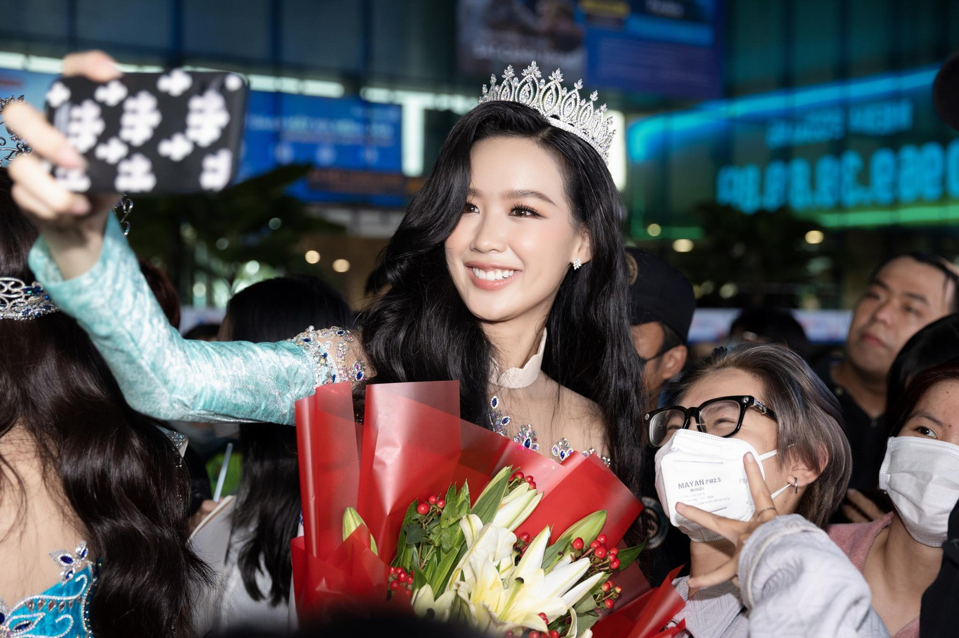 | Hoa hậu Mai Phương và hai Á hậu được chào đón khi xuống sân bay ở Tp.HCM. |