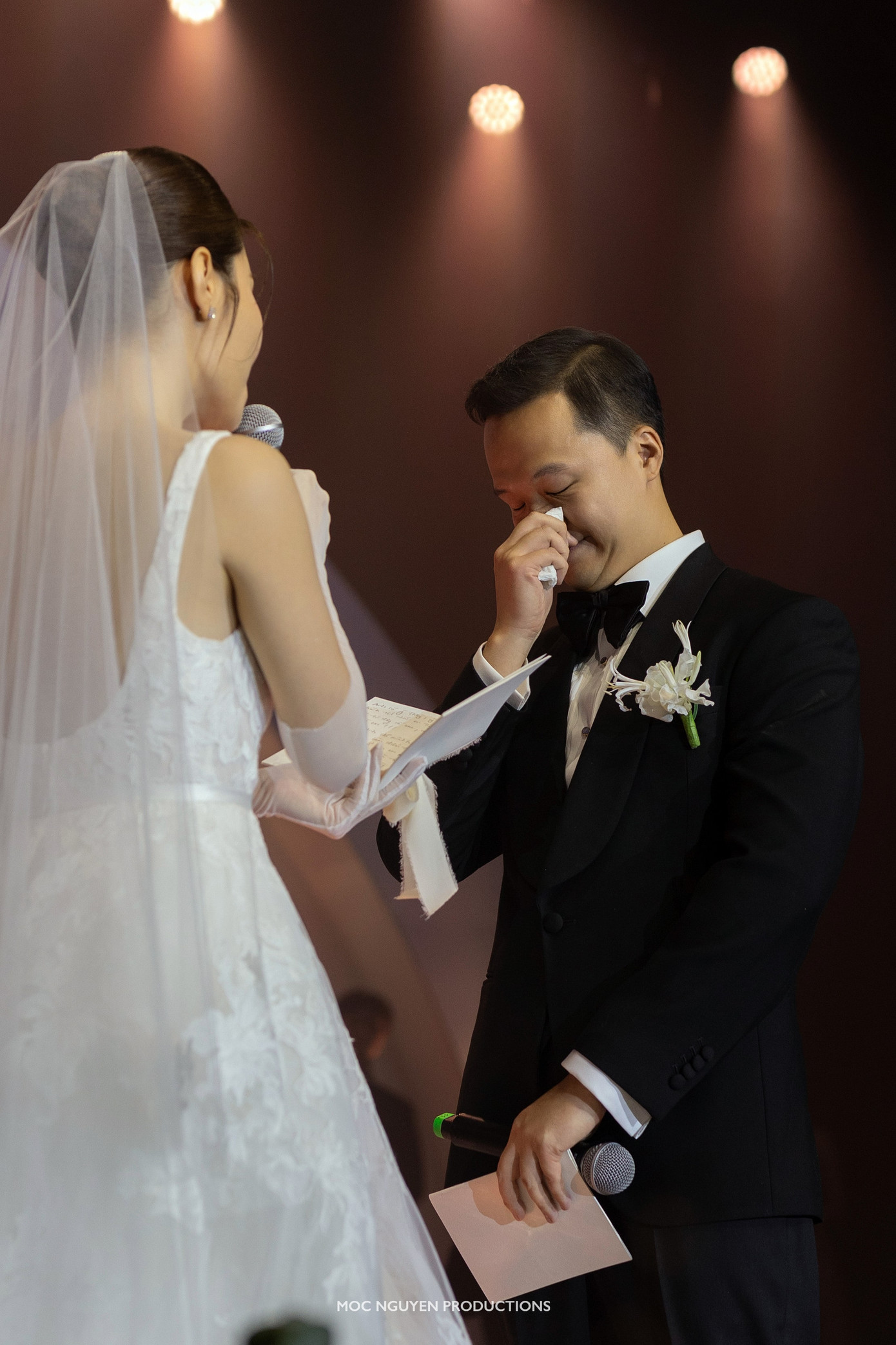 Chú rể Vinh Nguyễn cũng chia sẻ: “Em là nguồn cảm hứng và là nguồn động lực trong cuộc sống của anh. Mỗi khi anh nhìn thấy nụ cười trên môi của em thì anh biết rằng mọi khó khăn thử thách đều chắc chắn sẽ vượt qua. Anh yêu em”. Trong thời khắc thiêng liêng khi đọc lời thề nguyện, Diễm My và Vinh Nguyễn cũng đã vỡ òa và rơi những giọt nước mắt hạnh phúc trong ngày trọng đại nhất cuộc đời.
