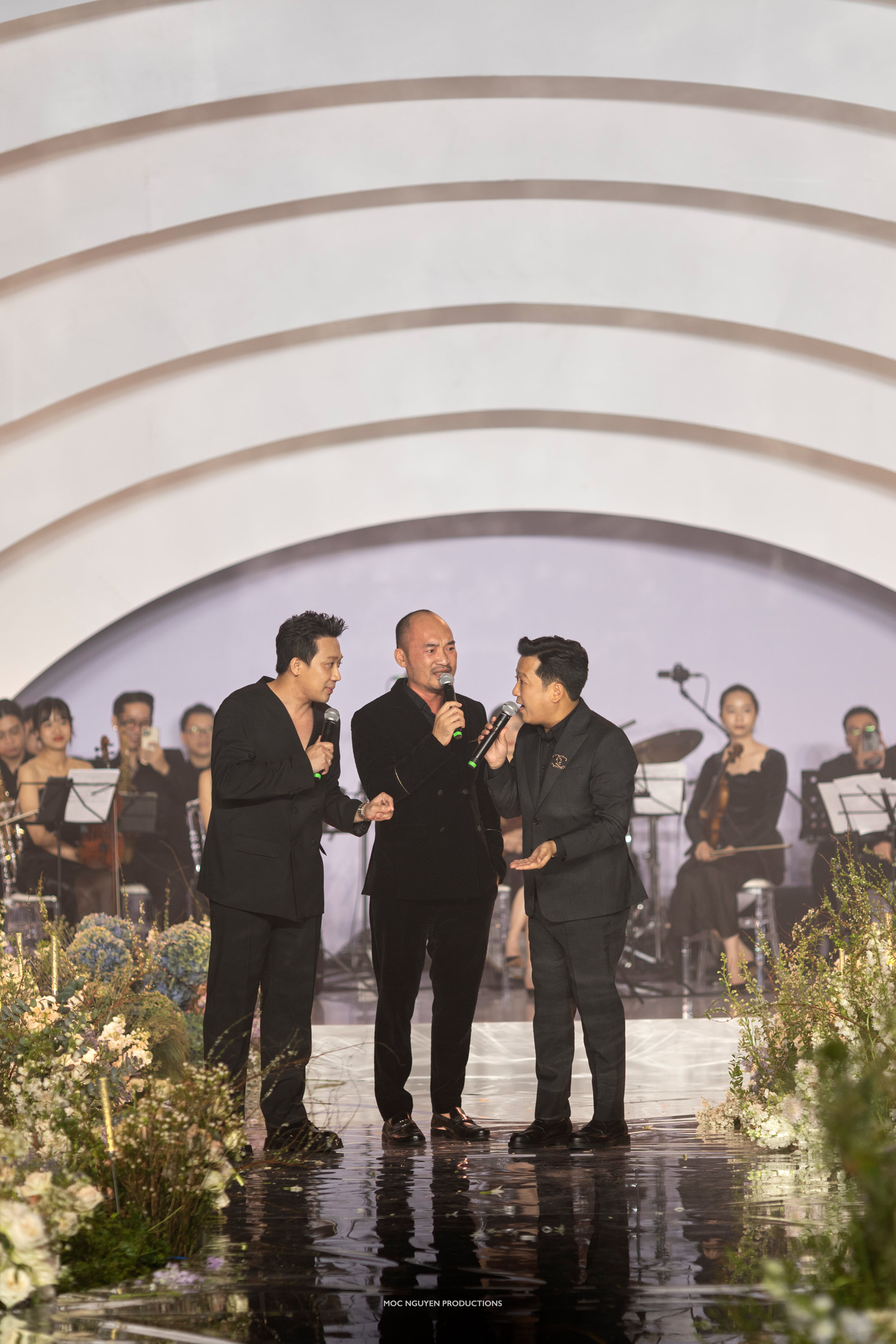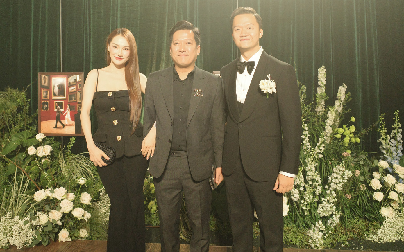 Tại đám cưới Diễm My 9X, dân tình cũng chú ý đến 'khoảnh khắc lịch sử' của showbiz Việt khi ba danh hài đình đám V-biz Trường Giang, Trấn Thành và Tiến Luật hội ngộ trên sân khấu, cùng gửi lời chúc đến cô dâu.