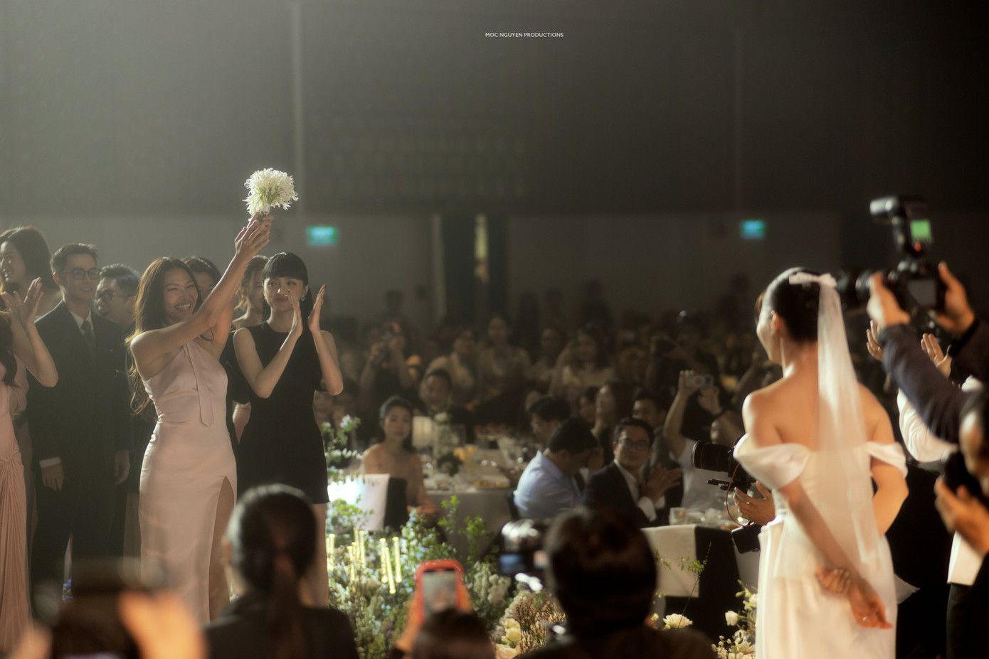 Cô dâu Diễm My cũng đã mời những người thân, bạn bè, đồng nghiệp thân thiết lên sân khấu để bắt đầu màn được mong chờ nhất nhì trong ngày này - tung hoa cưới. Có thể thấy, ai ai cũng rất vui vẻ và hào hứng với màn tung hoa này của Diễm My. Đặc biệt, Diệp Linh Châu là người thành công bắt được hoa cưới lần này.