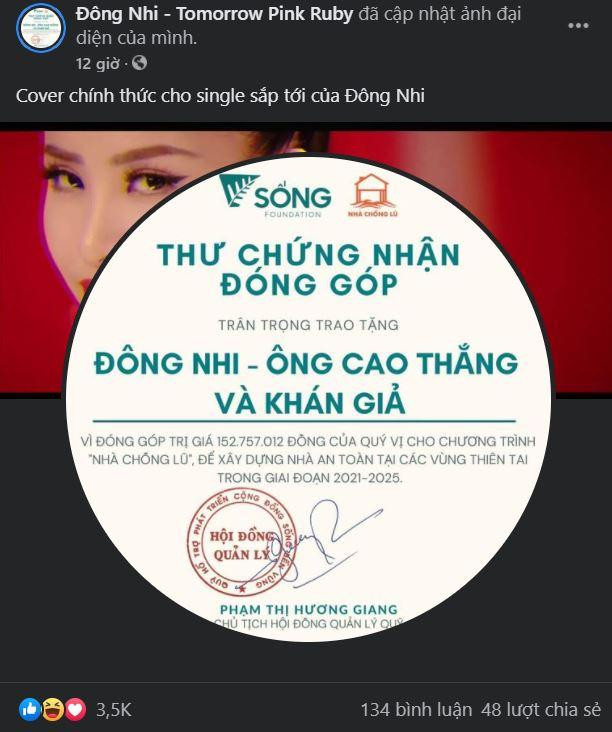 Người hâm mộ của Đông Nhi bày tỏ sự ủng hộ, hết mực tin tưởng của mình dành cho nữ ca sĩ. Một trong những trang fanpage lớn nhất nhì của nữ ca sĩ đã đổi cả ảnh đại diện sang tấm hình giấy chứng nhận đóng góp của vợ chồng Đông Nhi - Ông Cao Thắng và khán giả gửi đến đồng bào miền Trung thời gian qua. Tờ giấy chứng nhận này có ghi rõ tên của vợ chồng Đông Nhi, số tiền mà họ đã kêu gọi được để từ thiện, quyên góp cho đồng bào miền Trung và chữ kí dấu mộc xác nhận của hội đồng quản lý quỹ từ thiện. Thú vị hơn nữa, trang fanpage này còn ghi thêm chú thích đầy mùi cà khịa: "Cover chính thức cho single sắp tới của Đông Nhi".
