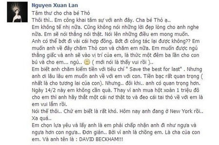 Siêu mẫu Xuân Lan từng gây xôn xao khi thông báo cha của con gái cô là... cầu thủ David Beckham khiến mọi người nửa tin nửa ngờ. Vì thấy dư luận ngày càng chú ý đến chuyện này, nhiều người còn chỉ trích Xuân Lan đưa tin thất thiệt ảnh hưởng đến danh tiếng David Beckham nên nữ siêu mẫu phải đính chính rằng cô chỉ đùa vui mà thôi.