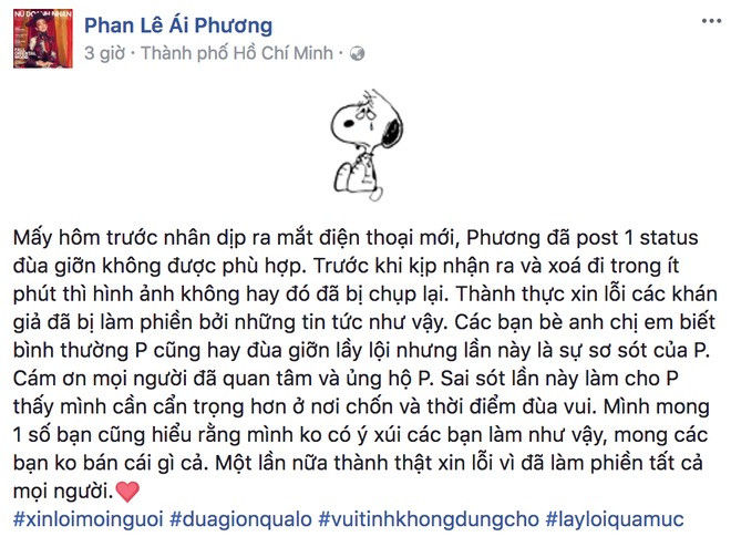 Ca sĩ Ái Phương có lần đề xuất mọi người làm một việc sai trái để có tiền mua iPhone mới. Tất nhiên bài đăng của cô bị phản ứng dữ dội nên Ái Phương đã phải gỡ ngay và có lời xin lỗi vì đùa giỡn không phù hợp. Nữ ca sĩ khẳng định sai sót này khiến cô hiểu ra mình cần phải cẩn trọng hơn, mong khán giả hiểu rằng cô không có ý xúi giục ai làm như vậy. Cô vốn là người hay đùa giỡn nên nói vui chứ thật sự không hề có ý như vậy.