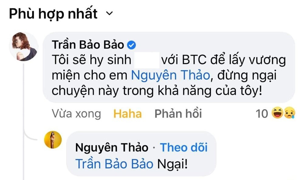 Khi người bạn thân là Nguyên Thảo đi thi Hoa hậu, BB Trần đã đăng trên mạng xã hội rằng anh "sẽ đi cửa sau" với ban tổ chức để lấy vương miện về cho Nguyên Thảo. BB Trần còn nhắn Nguyên Thảo đừng ngại vì việc này nằm trong khả năng của anh nhưng Nguyên Thảo đã đáp trả rằng cô ngại.