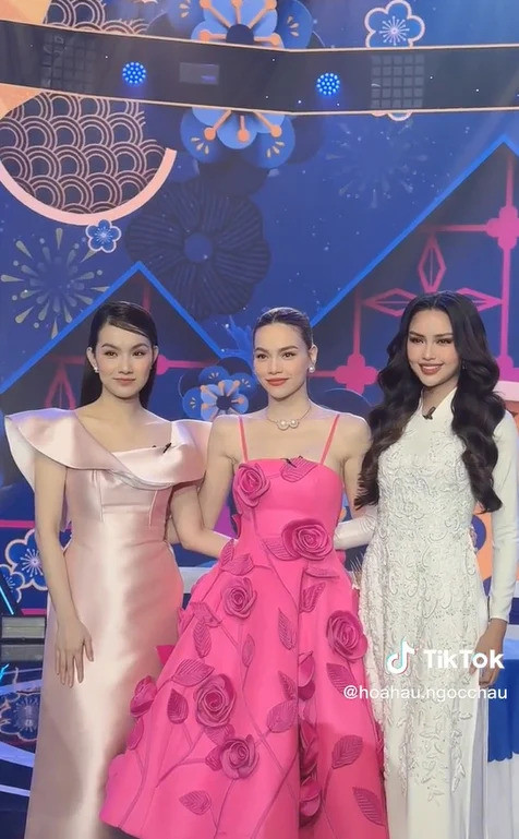 Tuy đứng kế bên 2 nàng hậu đình đám của showbiz Việt, Hồ Ngọc Hà vẫn nổi bật với nhan sắc "hack tuổi". Nữ ca sĩ xuất hiện với trang phục đầm hồng cùng hoạ tiết hoa nổi bật. Đứng chung khung hình với 2 nàng hậu, "nữ hoàng giải trí" vô tình chiếm trọn spotlight nhờ tone trang điểm nhẹ nhàng.