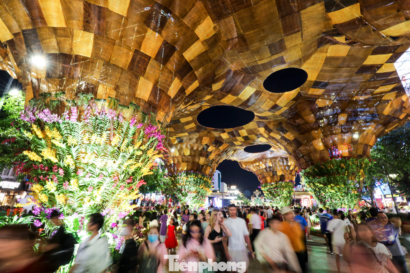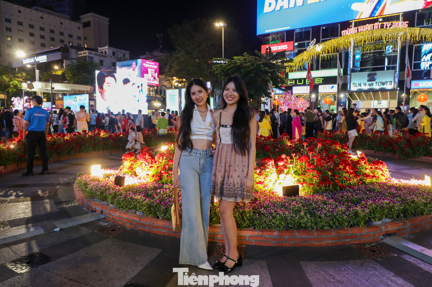 | Đường Nguyễn Huệ, phía trước khu vực đường hoa Nguyễn Huệ lúc 22 giờ đông nghẹt người dân ngồi chờ ngắm pháo hoa. |
