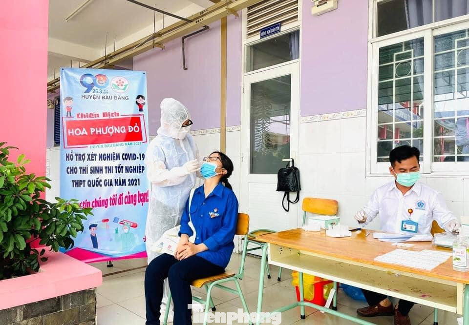Trước khi thí sinh đến thi, tình nguyện viên phối hợp với lực lượng chức năng xét nghiệm COVID-19, hướng dẫn cách phòng, chống dịch cho thí sinh.