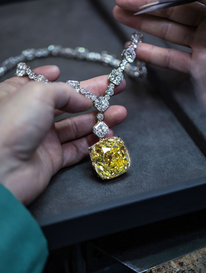 Mặt dây chuyền 84 carat lấy cảm hứng từ viên kim cương màu vàng Tiffany được bán với giá 5 triệu USD (hơn 127 tỷ VND). Điều thú vị là nhân viên an ninh đặc biệt và một chiếc xe bọc thép đã được điều động đến trường quay trong quá trình quay phim để đảm bảo an toàn cho món đồ trang sức quý giá.