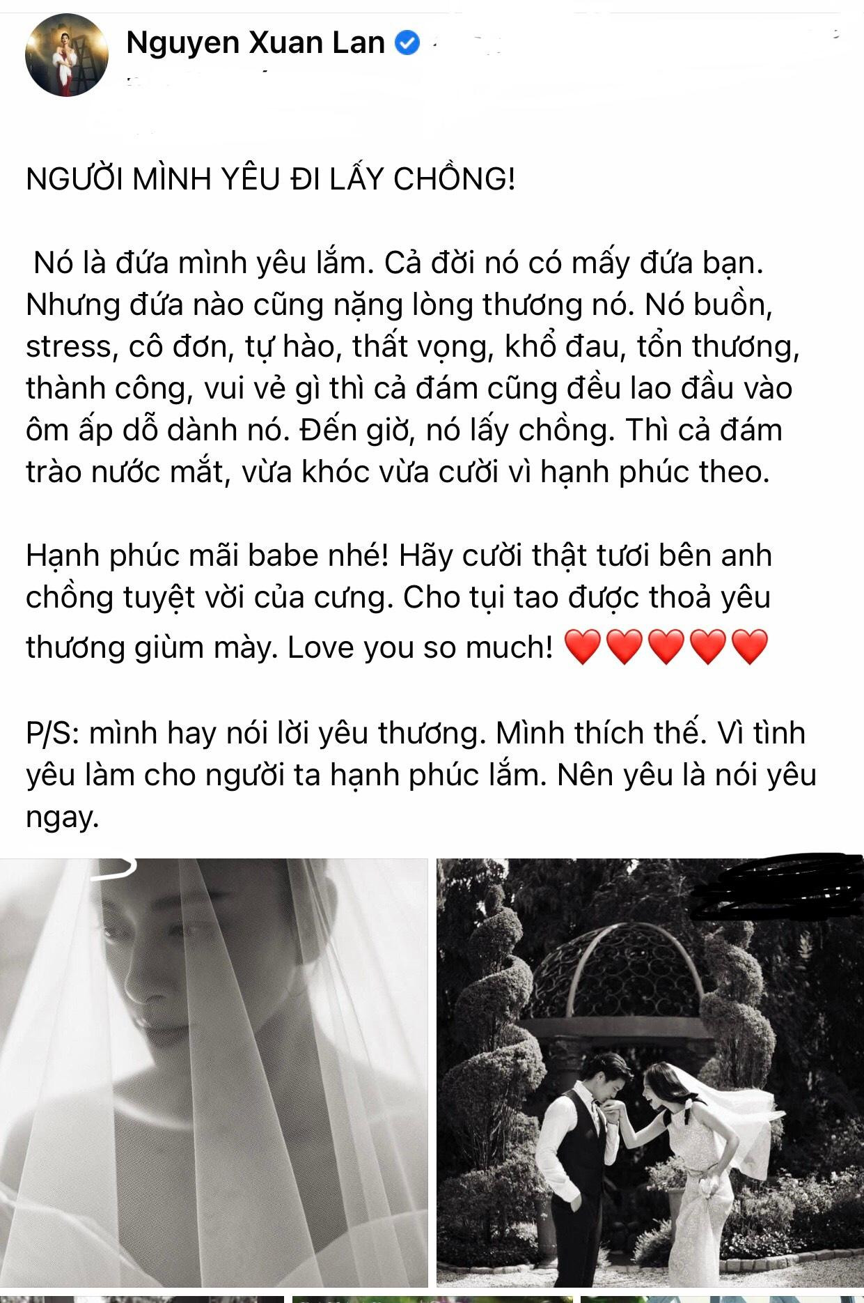 Khi nhận được thiệp cưới của Ngô Thanh Vân, siêu mẫu Xuân Lan đã bày tỏ sự xúc động bằng dòng trạng thái dài trên MXH với tiêu đề: "Người mình yêu đi lấy chồng". HLV của The Next Gentleman kể về những điều đáng quý trong tình bạn nhiều năm với nàng "đả nữ", đồng thời gửi lời chúc phúc đến Huy Trần và Ngô Thanh Vân.