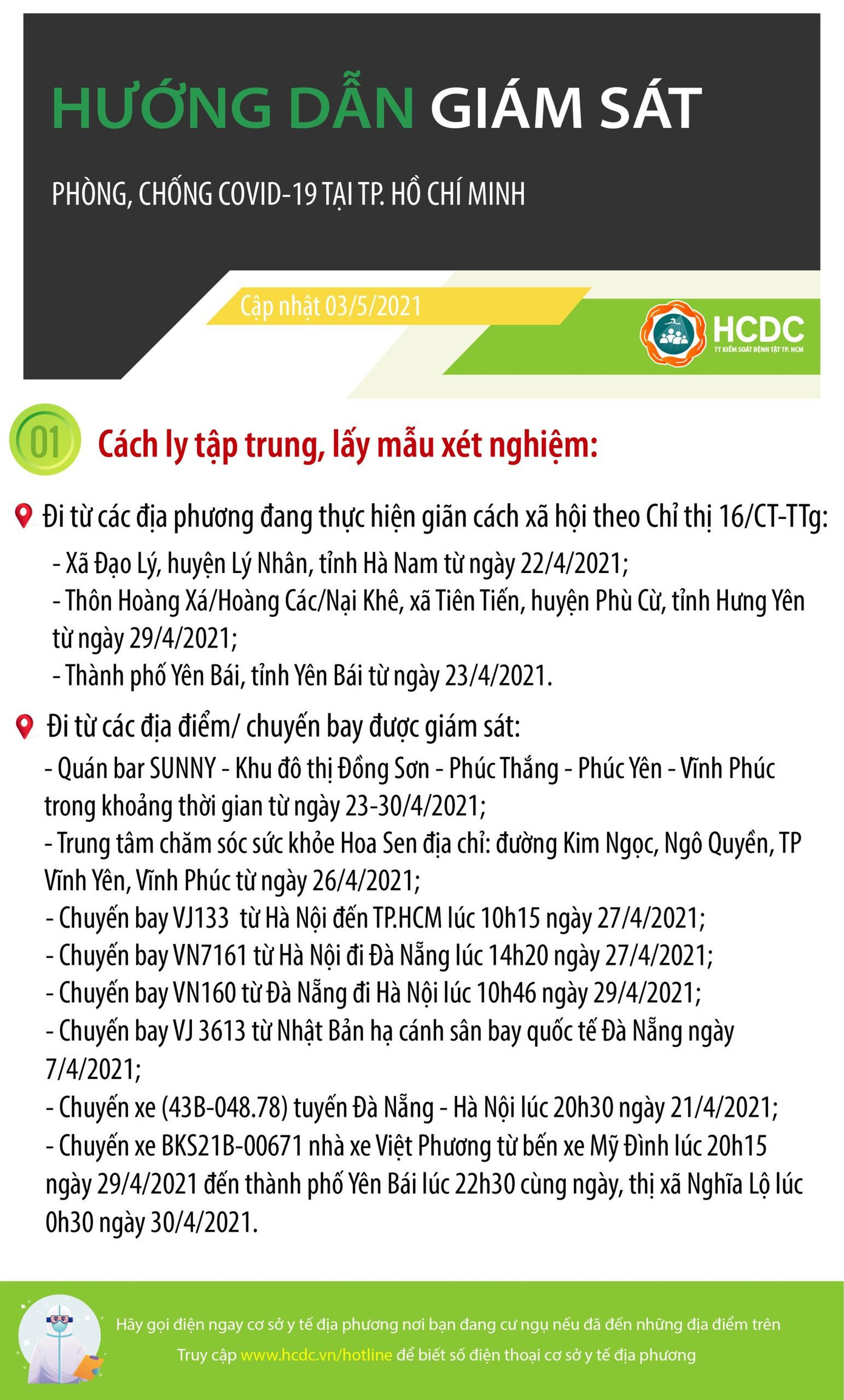 Tối ngày 3/5, Trung tâm Kiểm soát bệnh tật TP.HCM (HCDC) phát thông báo mới nhất về việc hướng dẫn giám sát những người từ các tỉnh thành khác đến thành phố. Cập nhật mới nhất TP.HCM vừa mở rộng giám sát thêm người về từ một số địa phương.