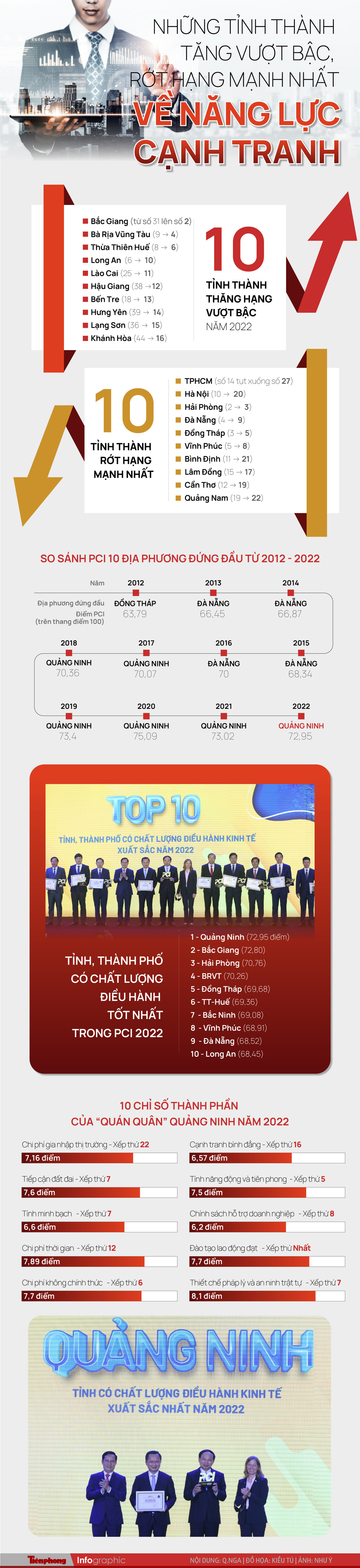 TPO - Trong 10 năm qua, Đà Nẵng và Quảng Ninh luân phiên nhau giữ vị trí “quán quân” chỉ số năng lực cạnh tranh cấp tỉnh (PCI). Năm 2022, nhiều “đầu tàu” kinh tế tụt hạng, nhưng một số địa phương đã bứt phá mạnh mẽ trong cải cách môi trường đầu tư kinh doanh.