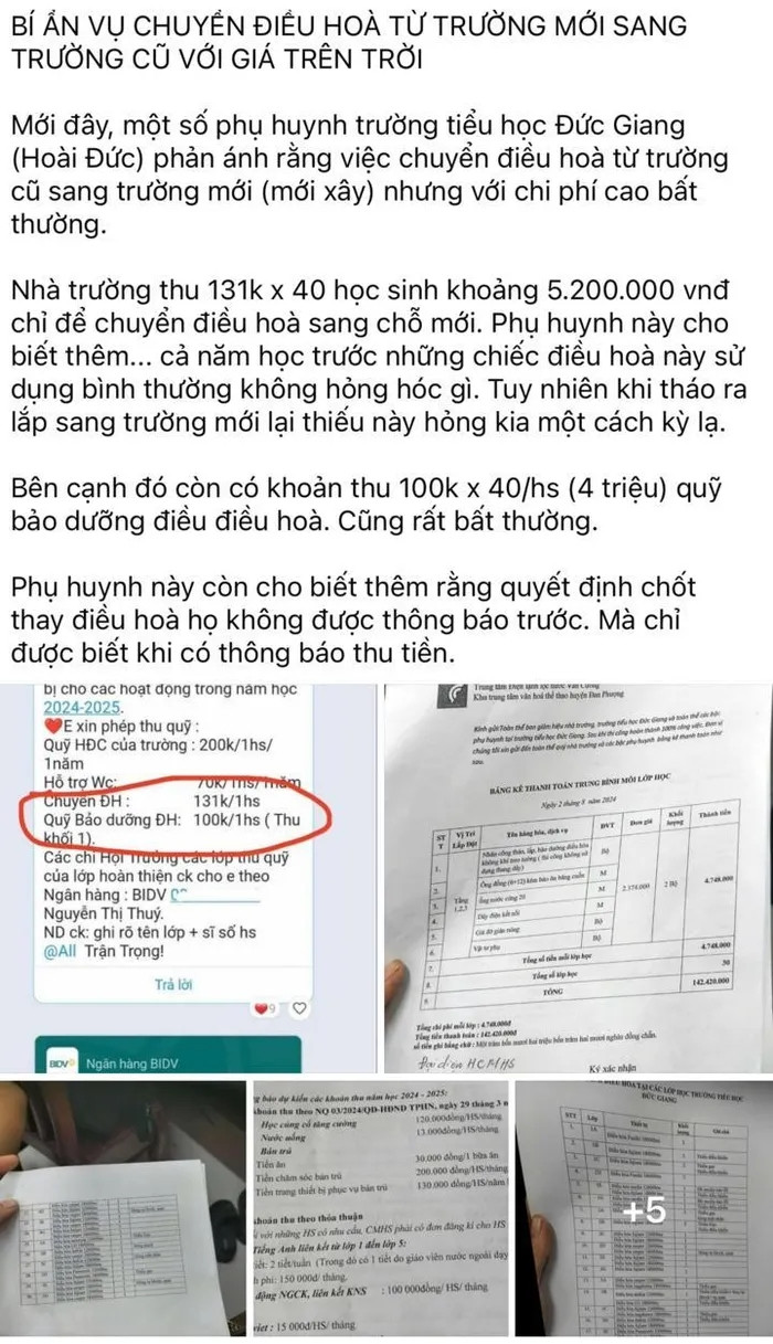 Ngày 3/10, chị N.H có con học lớp 4 tại trường Tiểu học Đức Giang (huyện Hoài Đức, Hà Nội) cho biết, chị và nhiều phụ huynh khác trong lớp rất bức xúc trước thông báo trường thu tiền phí chuyển điều hòa từ cơ sở cũ sang cơ sở mới (cách nhau 2km), mỗi học sinh đóng 131.000 đồng.