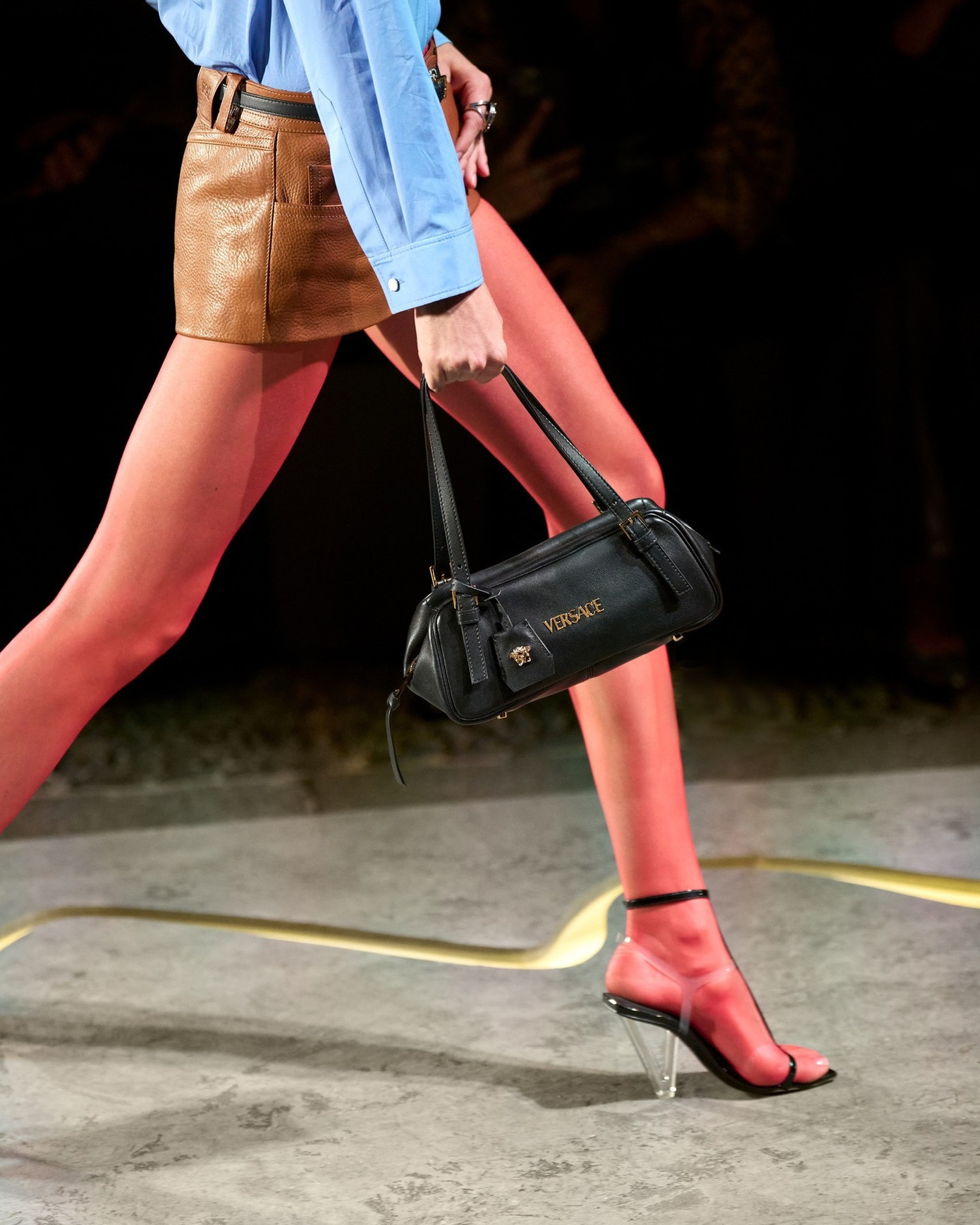 Còn đến với Versace, giới mộ điệu được hồi tưởng về những năm 90 qua các thiết kế lấy cảm hứng từ bộ sưu tập Versus Xuân 1997 và những đôi tất dài siêu mỏng phối cùng giày cao gót nóng bỏng. Buổi trình diễn của Versace trong Lâu đài cổ Sforza tại Milan đã mang đến một vẻ đẹp cổ điển nhưng không kém phần nổi bật, đưa xu hướng tất dài trở thành trung tâm của sự bàn tán.