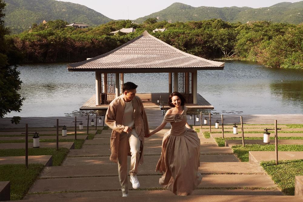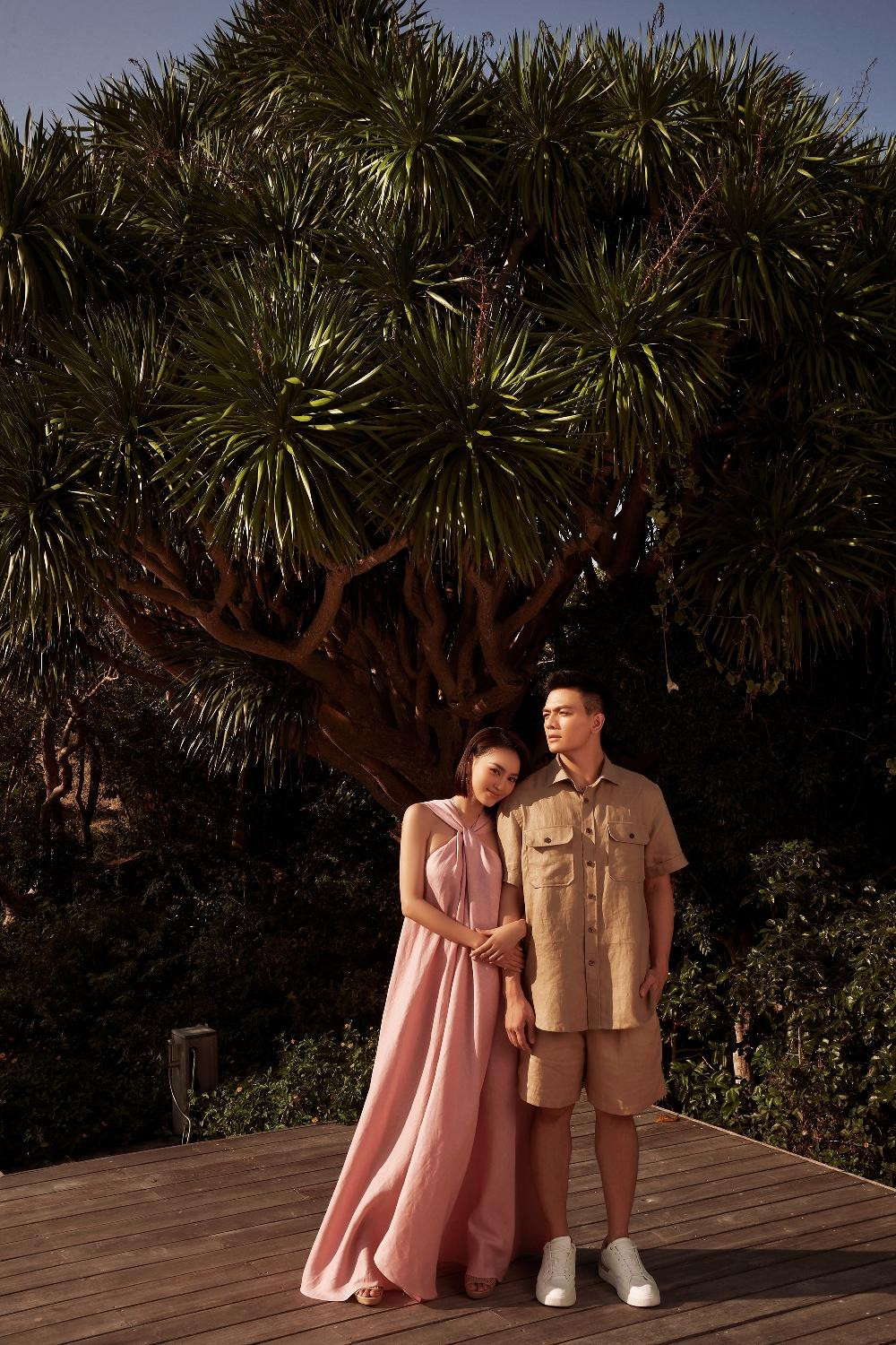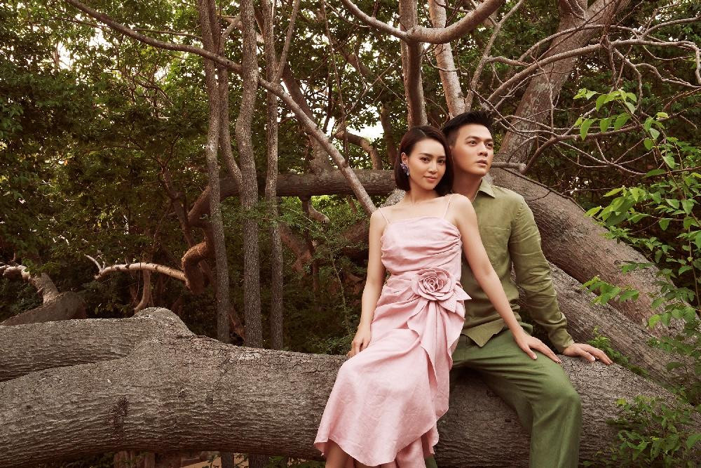 Đôi “tình nhân màn ảnh” mang đến sự trẻ trung, cuốn hút khi kết hợp sắc xanh rêu cùng tông hồng sáng ngọt ngào. Linen là chất liệu khó xử lý phom trang phục bởi độ mềm, nhàu đặc trưng. NTK Đỗ Mạnh Cường đã giúp linen được nâng tầm với những phom váy được xử lý kỳ công.