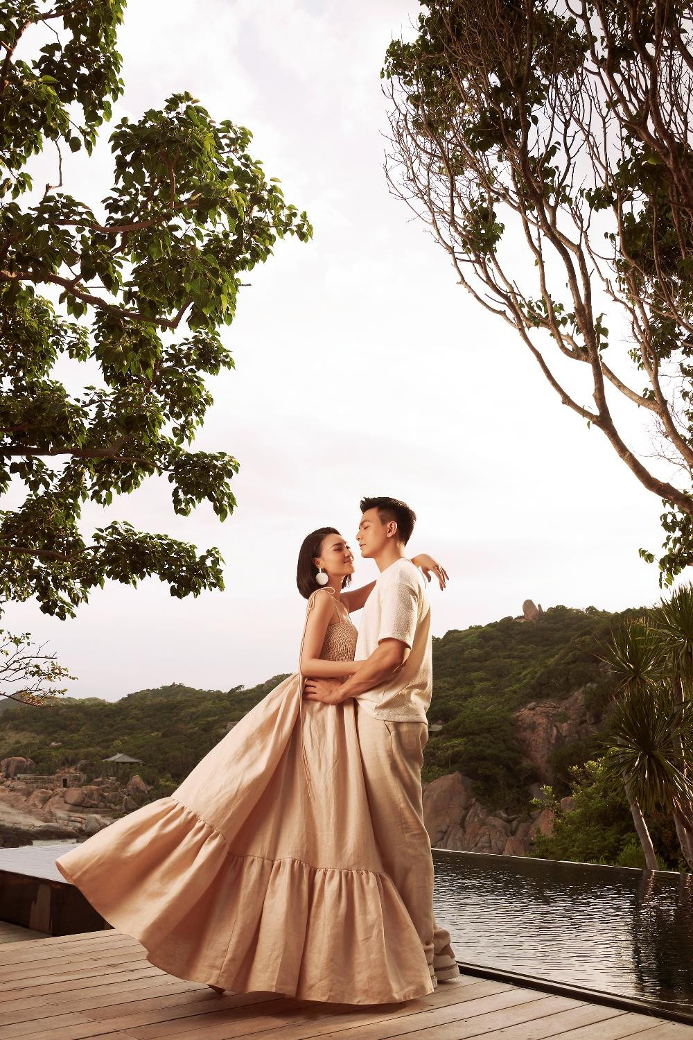Trong những chuyến nghỉ dưỡng mùa Hè, dáng váy maxi dài, rộng không thể thiếu với phái đẹp. Ninh Dương Lan Ngọc chọn váy màu xanh lam, đi cùng bộ cánh màu nâu của Lê Xuân Tiền.