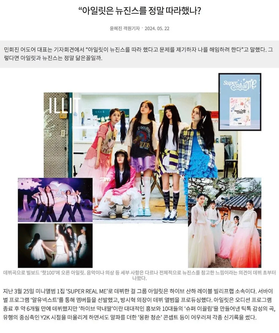 Sau tuyên bố của BELIFT, một bài báo được đăng tải đã lọt hot topic của diễn đàn theqoo. Tựa đề là "ILLIT có thực sự sao chép NewJeans hay không?". Nội dung chia ra làm các mục, nhắc lại về tranh cãi đạo nhái của ILLIT xuất hiện từ khi nhóm chuẩn bị ra mắt. Tác giả đưa ra các phân tích của luật sư, củng cố cho luận điểm về việc concept thuộc về ý tưởng không được luật bản quyền bảo vệ.