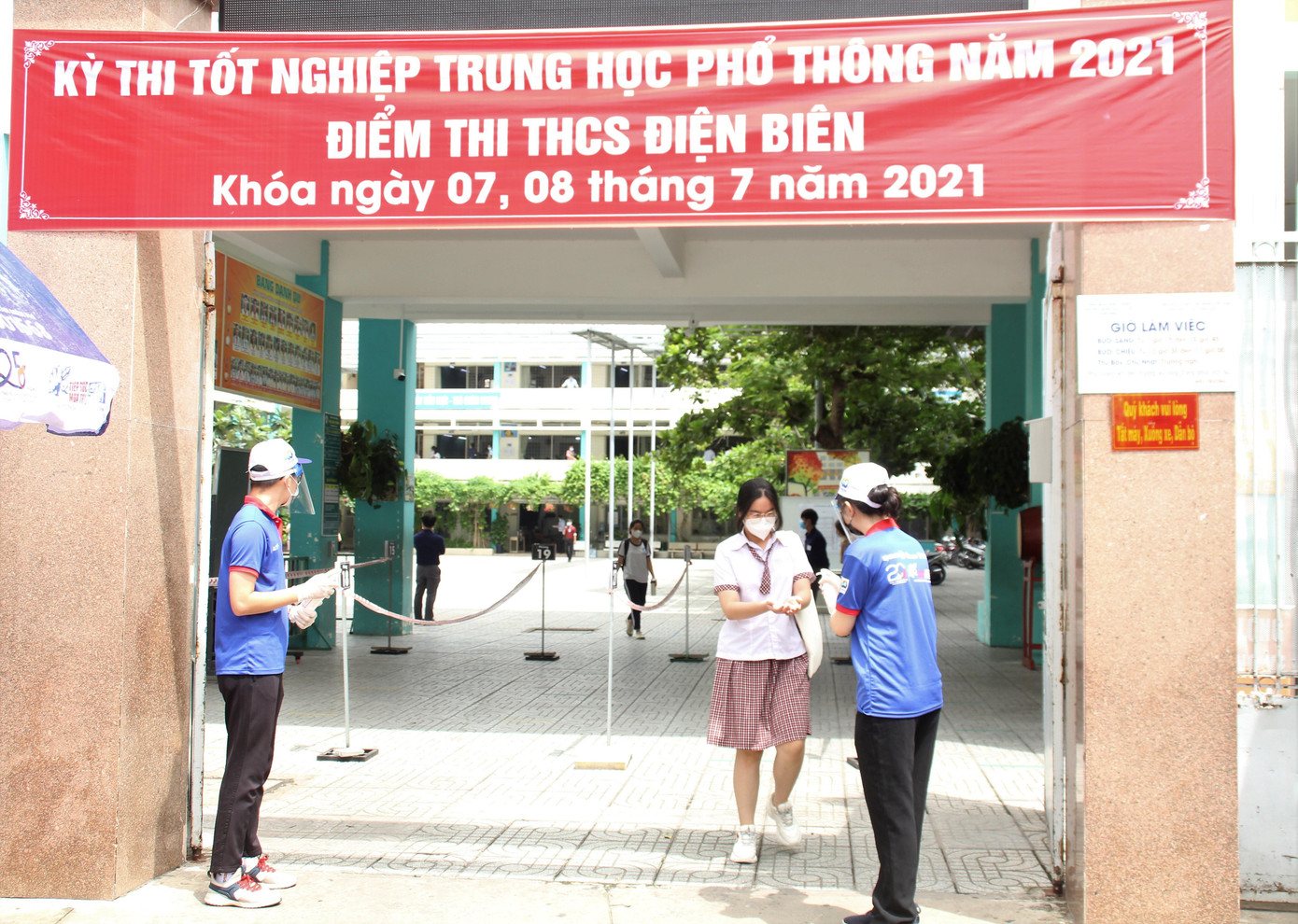 | Các em thí sinh tại hội đồng thi này liền được rửa tay sát khuẩn ngay sau khi ra cổng. Tình nguyện viên chương trình Tiếp sức mùa thi tại đây cũng nhanh chóng tặng kính chắn, bánh, nước để động viên các em thí sinh trong buổi thi tiếp theo |