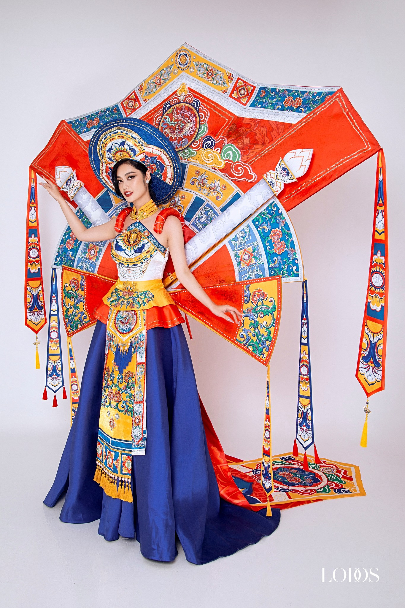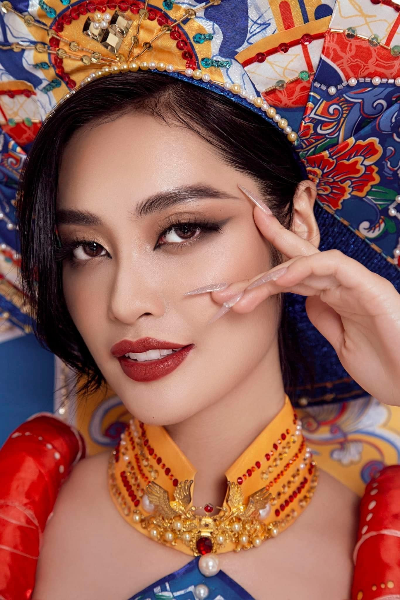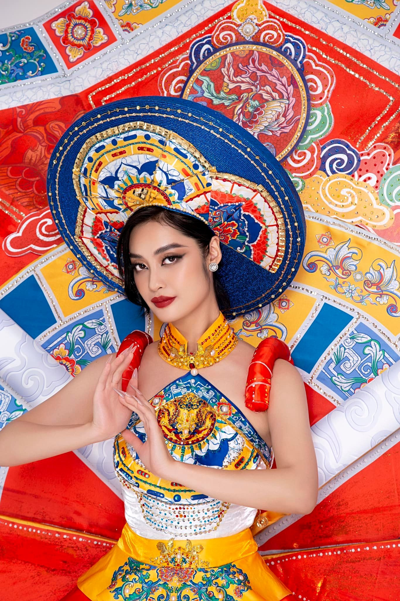 Góp phần trong việc quảng bá văn hóa Việt Nam đến bạn bè quốc tế, Nông Thúy Hằng còn gây ấn tượng với trang phục dân tộc. Người đẹp 24 tuổi chọn thiết kế “Dấu ấn pháp lam” của nhà thiết kế Nguyễn Việt Hưng cho phần thi quan trọng này. Bộ trang phục được lấy cảm hứng từ nghệ thuật pháp lam Huế, di sản vật thể cung đình độc đáo.