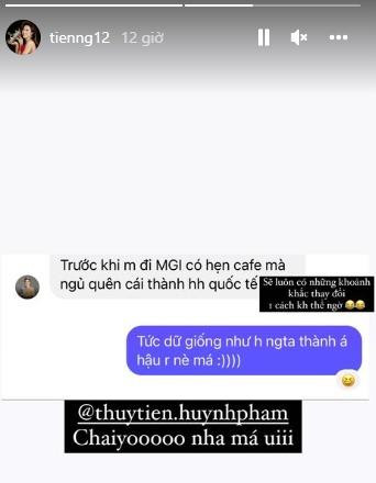 Hai cô gái còn chia sẻ loạt tin nhắn rất dễ thương. Trong đó Á hậu Thủy Tiên than thở rằng hai người đã hẹn nhau đi cà phê trước khi Thùy Tiên lên đường dự thi Hoa hậu Hòa bình Quốc tế nhưng cuộc hẹn không thành vì... Thủy Tiên ngủ quên. Kết quả là sau đó Thùy Tiên đã thành Hoa hậu quốc tế còn Thủy Tiên cũng giành thứ hạng cao ở Hoa hậu Hoàn vũ Việt Nam 2022.