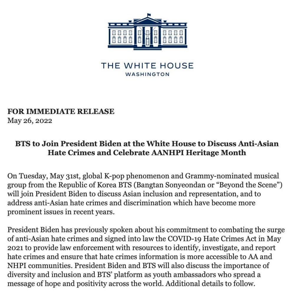 Thông báo từ Nhà Trắng có đoạn viết: “Vào thứ Ba tới, ngày 31/5, nhóm nhạc K-Pop toàn cầu và nghệ sĩ được đề cử Grammys BTS (Bangtan Sonyeondan hoặc Beyond the Scene) sẽ cùng với Tổng thống Mỹ Joe Biden thảo luận về làn sóng thù ghét người châu Á và nạn phân biệt chủng tộc đối với người châu Á - một vấn đề đang trở nên nhức nhối trong những năm gần đây.