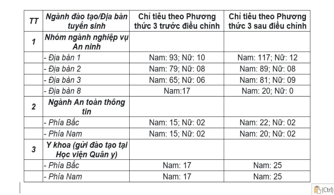 Theo quy định của Bộ Công an, chỉ tiêu còn thừa của phương thức 1, phương thức 2 sẽ được chuyển sang phương thức 3 (xét tuyển theo kết quả thi tốt nghiệp THPT kết hợp với kết quả học tập THPT). Do đó, Học viện An ninh nhân dân thông báo điều chỉnh chỉ tiêu trong Đề án tuyển sinh trình độ đại học như sau: