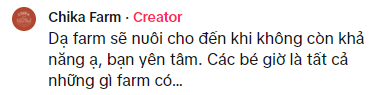 Trả lời bình luận của cư dân mạng hỏi về tình hình của thú nuôi sẽ ra sao, phía Chika Farm cho biết sẽ nuôi các bé đến khi hết khả năng. Điều này khiến nhiều người an tâm, thậm chí có Vnet còn ngỏ ý sẵn lòng tạo điều kiện giúp đỡ nếu phía nông trại gặp khó khăn.
