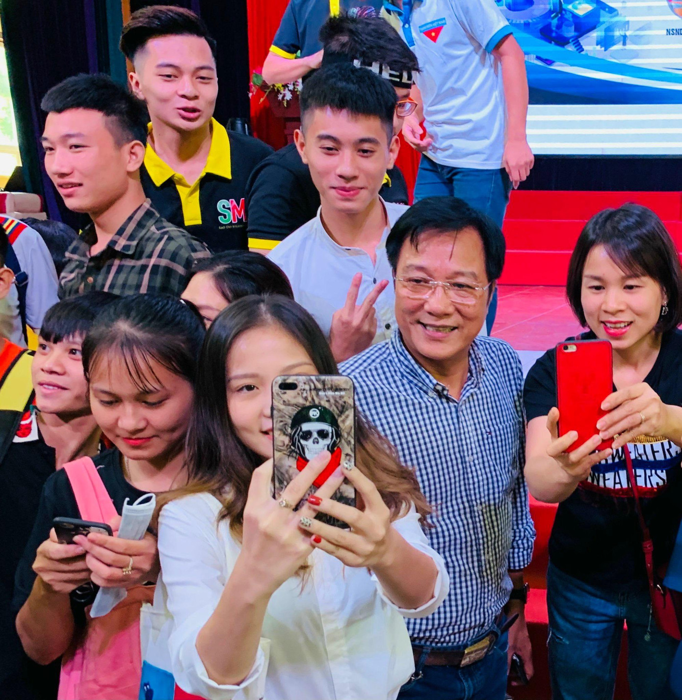 | NSND Trọng Trinh, NSND Lan Hương cùng sinh viên và giảng viên trường ĐH Thương mại. |