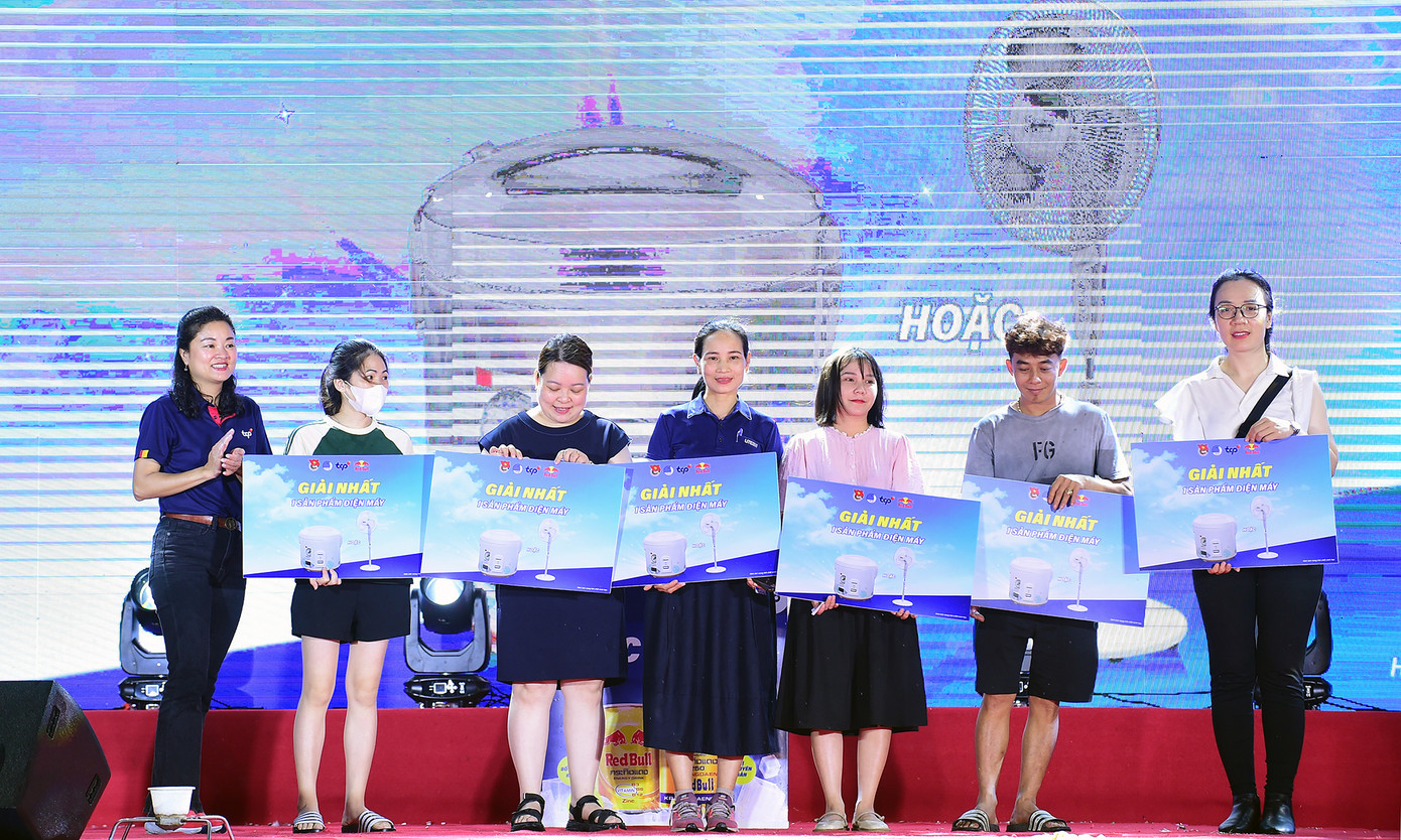 | Các thanh niên công nhân may mắn trúng thưởng trong ngày hội. Ảnh: Xuân Tùng |