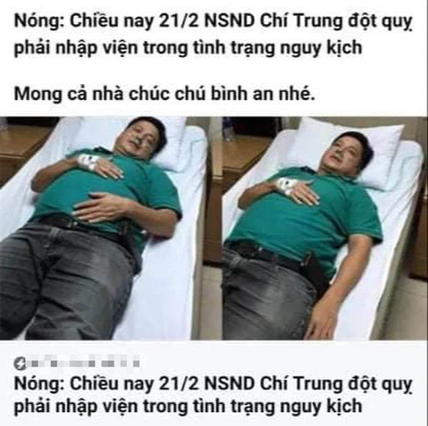 Tối 21/2, nghệ sĩ Chí Trung đăng tải bài viết ác ý của một tài khoản mạng xã hội chia sẻ hình ảnh anh nằm trên giường bệnh với tựa đề: "Nóng: Chiều nay 21/2 NSND Chí Trung đột quỵ, phải nhập viện trong tình trạng nguy kịch".