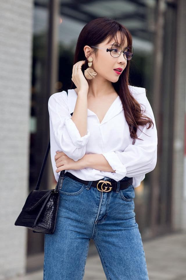 Cũng chiếc thắt lưng ấy, nếu như kết hợp với áo sơ mi trắng, quần jeans suông rộng như Lưu Hương Giang chẳng hạn, trông sẽ tôn dáng hơn nhiều. Vẫn đảm bảo sự gọn gàng, năng động cho một cô kỹ sư điện nước mà lại giúp Nam nhìn thon thả, hiện đại hơn hẳn.