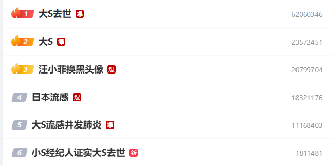 Ngay khi tin tức được công bố, các từ khóa liên quan đến nữ diễn viên như "Đại S", "Đại S qua đời", "cúm Nhật Bản" nhanh chóng leo lên top đầu Hot Search của Weibo. Đáng chú ý, chỉ trong vòng chưa đầy một tiếng, cụm từ "Đại S qua đời" đã vượt mốc 60 triệu lượt truy cập, cho thấy mức độ quan tâm lớn của công chúng đối với sự kiện này.
