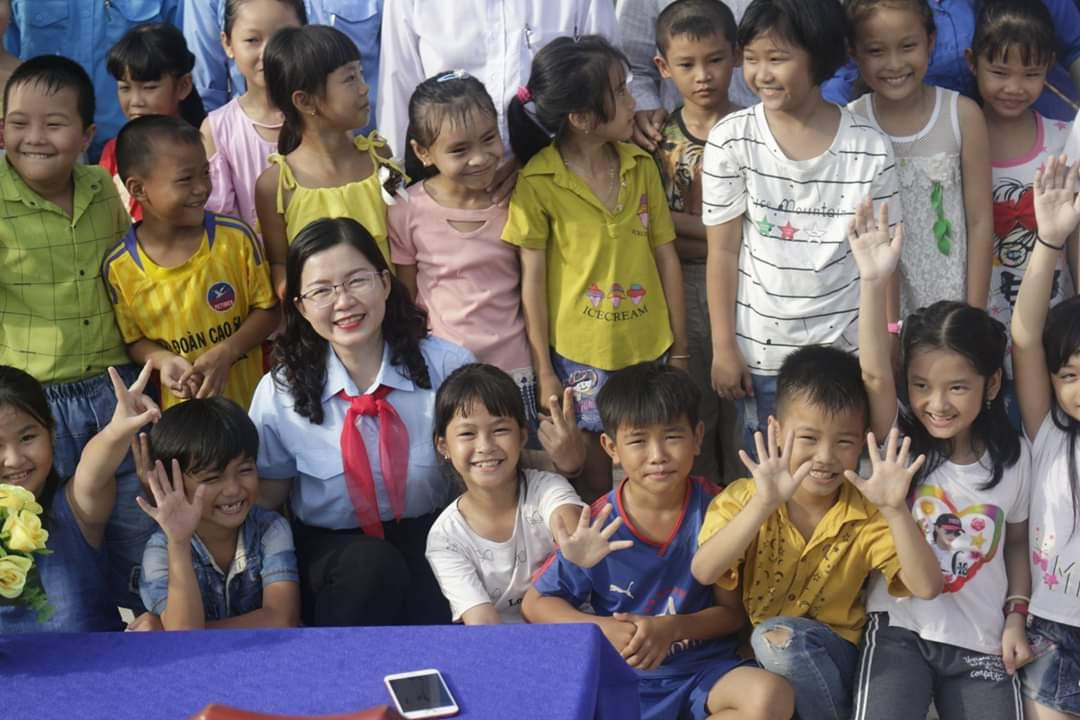 | Chị Chuyên cùng các đơn vị trao tặng Nhà khăn quàng đỏ cho học sinh nghèo |