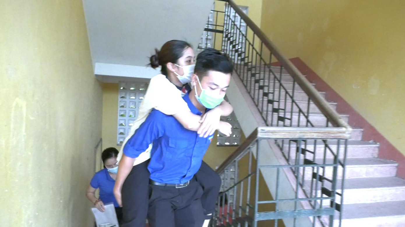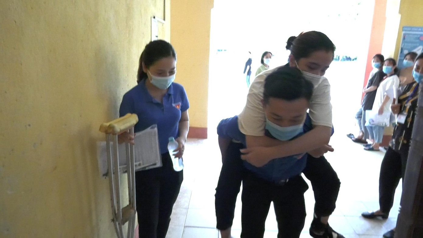 | Cõng thí sinh bị thương ở chân đến địa điểm thi |