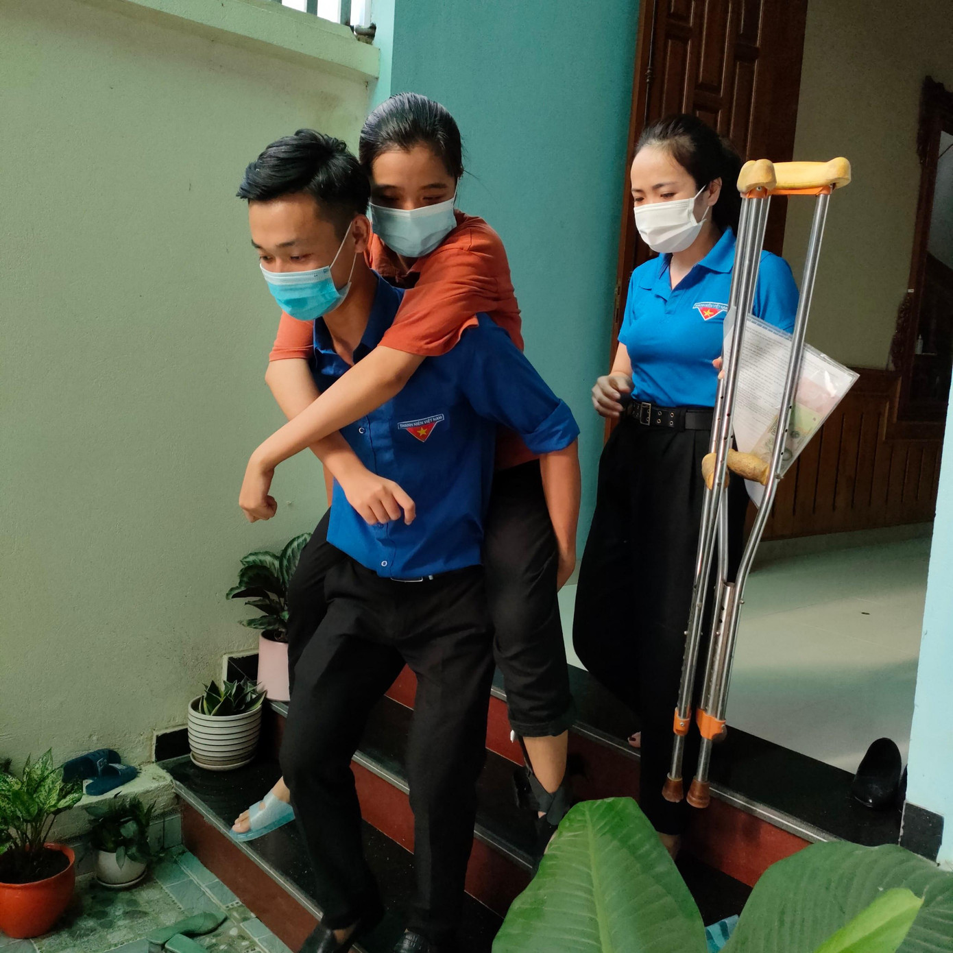 Khoảng cách từ nhà đến điểm thi trường THPT Lang Chánh hơn 1km. Các tình nguyện viên cùng gia đình dùng xe máy, chở em từ nhà đến trường, sau đó hỗ trợ và cõng em vào phòng thi.