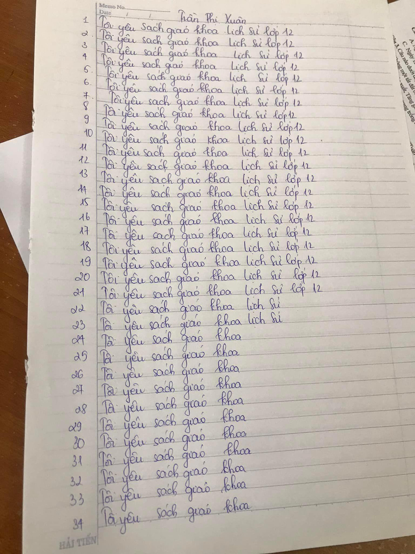 Cụ thể, một nữ sinh mới đây đã chia sẻ lại hình ảnh trang giấy chép phạt của mình lên mạng xã hội. Theo đó, trong tiết học Lịch sử, cô bạn đã quên mang theo sách giáo khoa. Và thế là ngay lập tức bị thầy bắt chép phạt 99 lần dòng chữ: "Tôi yêu sách giáo khoa Lịch sử lớp 12" như một cách nhắc nhở để lần sau không tái phạm nữa.