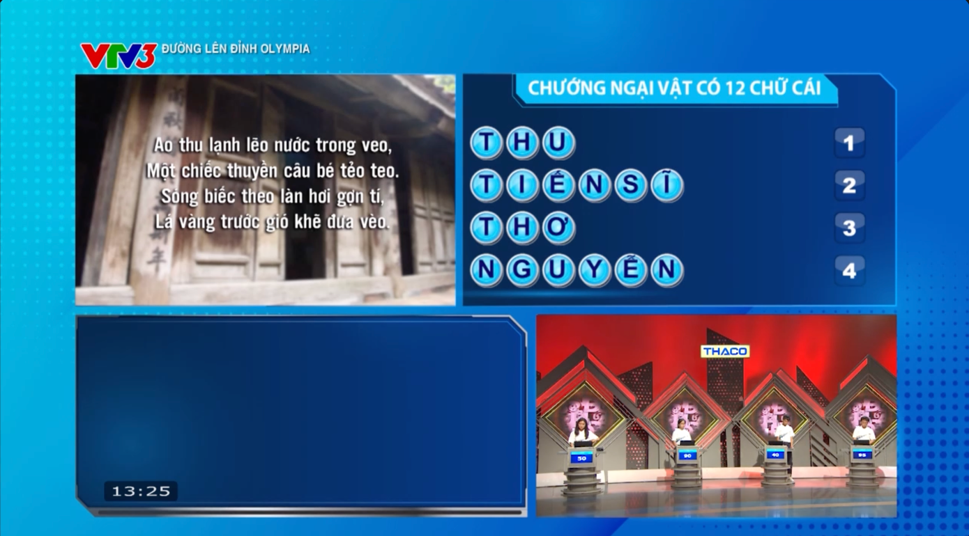 Ở hàng ngang được chọn thứ 3, Trân Châu và Tuấn Minh trả lời chính xác với đáp án là “Thơ” khi điền từ vào chỗ trống. Sau câu hỏi này, Minh Chiến đã giải đáp ẩn số cần tìm là “Nguyễn Khuyến” và vươn lên dẫn đầu với 95 điểm. Theo sát là Trân Châu với 90 điểm, Linh Giang 60 điểm và Tuấn Minh 40 điểm.