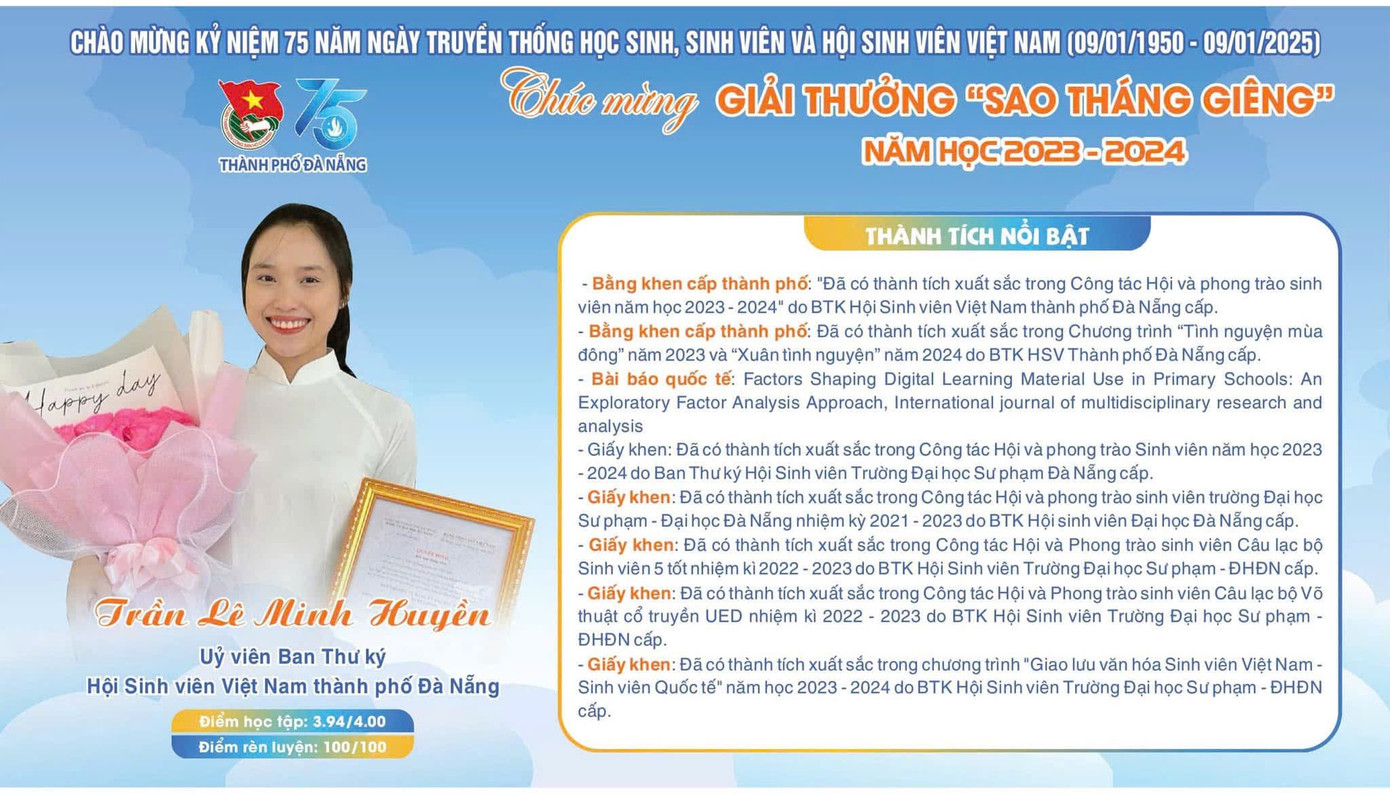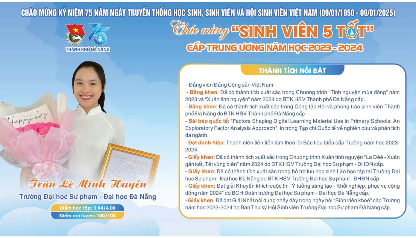 Chia sẻ cảm xúc khi nhận được 2 giải thưởng cao quý của Trung ương Hội Sinh viên Việt Nam, Huyền cho biết: “Mình thực sự vỡ oà khi đã chinh phục được 2 giải thưởng cao quý này. Đó là một niềm vinh dự, tự hào khi là 1 trong 357 sinh viên ưu tú toàn quốc đạt được danh hiệu "Sinh viên 5 tốt" cấp Trung ương và 1 trong 112 sinh viên đạt giải thưởng “Sao tháng giêng” cấp Trung ương năm học 2023 - 2024. Đây không chỉ là cột mốc đáng nhớ mà còn là dấu ấn đẹp đẽ của mình dưới mái Trường Đại học Sư phạm - Đại học Đà Nẵng”.