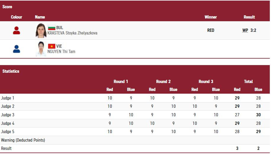 Tay đấm Việt Nam thi đấu khởi sắc trong hiệp 2 và được nhận nhiều điểm hơn Stoyka Krasteva. Tuy nhiên, Nguyễn Thị Tâm liên tục bị đối thủ phản đòn trong hiệp thi đấu quyết định và chấp nhận thất bại 2-3 từ điểm các giám khảo.