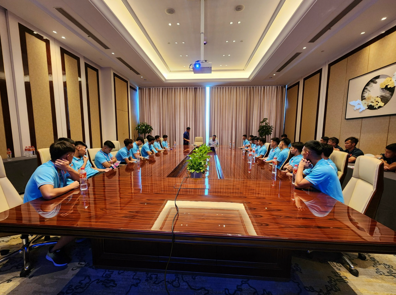 Trưa nay, đội tuyển Olympic Việt Nam đã có cuộc họp, với sự tham dự của Chủ tịch Liên đoàn bóng đá Việt Nam (VFF) Trần Quốc Tuấn. Ông Trần Quốc Tuấn đang làm nhiệm vụ Trưởng đoàn môn bóng đá nam, nữ tại Asiad 19 đã thăm, tìm hiểu điều kiện sinh hoạt, tập luyện của đội tuyển Olympic Việt Nam.