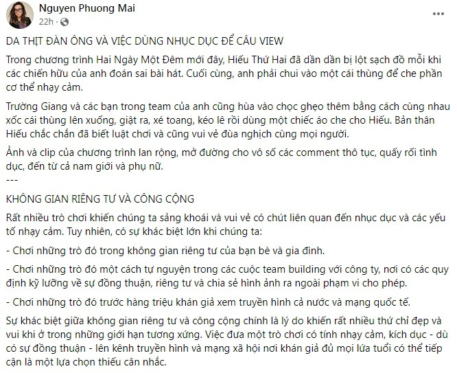Mới đây nhất, bài viết của PGS. Tiến sĩ Nguyễn Phương Mai khiến cộng đồng mạng xôn xao khi chị đưa ra những quan điểm thẳng thắn về việc "câu view" phản cảm bằng cách "phơi bày cơ thể" người tham gia show thực tế. Chị Phương Mai cũng đặt ra tình huống nếu HIEUTHUHAI "hoán đổi giới tính" bằng một nghệ sĩ nữ và chỉ ra sự khác biệt trong cách phản ứng của netizen về việc này. Bài viết hiện đang nhận về nhiều ý kiến bày tỏ sự đồng tình.