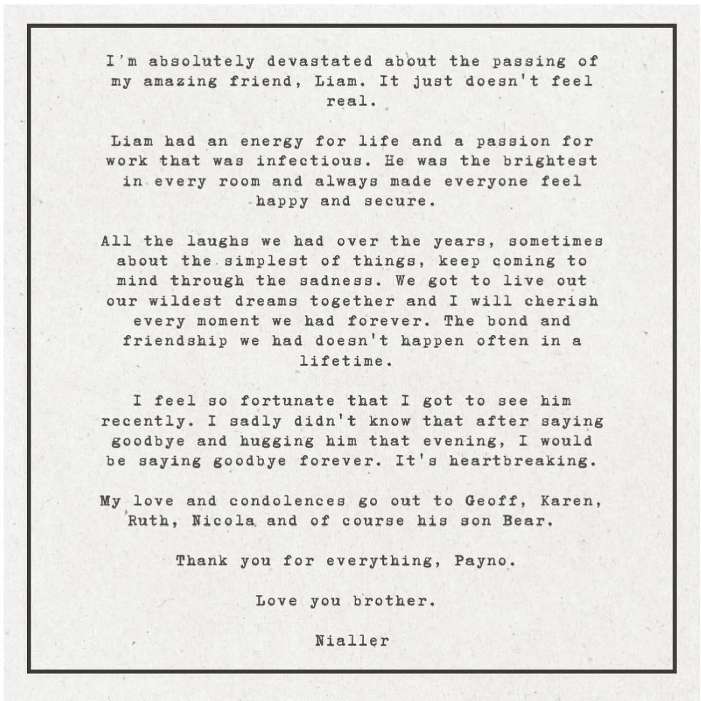 Mới đây, Niall Horan đã có những chia sẻ về sự ra đi của người bạn thân trên trang cá nhân, anh viết: "Tôi cảm thấy may mắn vì đã được gặp anh ấy thời gian gần đây. Tôi đau buồn khi không biết rằng sau lời tạm biệt và ôm lấy Liam tối đó, tôi sẽ phải nói lời từ biệt vĩnh viễn. Nó khiến trái tim tôi tan vỡ."