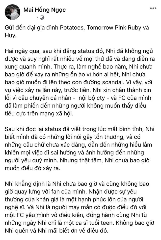 Gửi đến đại gia đình Potatoes, Tomorrow Pink Ruby và Huy. Hai ngày qua, sau khi đăng status đó, Nhi đã không ngủ được và suy nghĩ rất nhiều về mọi thứ đã và đang diễn ra xung quanh mình. Thực ra, làm nghề bao năm, Nhi chưa bao giờ để xảy ra những ồn ào vì hơn ai hết, Nhi chưa bao giờ muốn đi lên theo con đường scandal. Vì vậy, với vụ việc xảy ra lần này, trước tiên, Nhi xin chân thành xin lỗi vì câu chuyện cá nhân - nội bộ cty - và FC của mình đã làm phiền đến những người không muốn thấy điều tiêu cực trên mạng xã hội.
