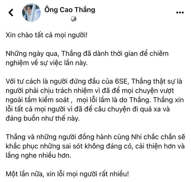 Thắng và những người đồng hành cùng Nhi chắc chắn sẽ khắc phục những sai sót không đáng có, cải thiện hơn và lắng nghe nhiều hơn. Một lần nữa, xin lỗi mọi người rất nhiều!"