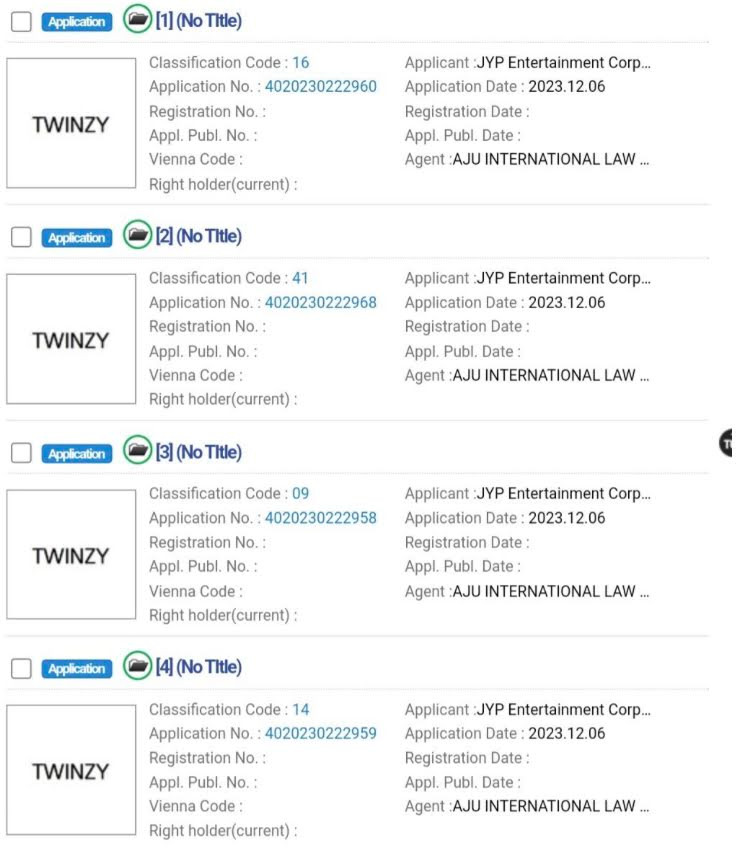 Cư dân mạng cho rằng, họ đã tìm ra tên của siêu nhóm nhạc nhà JYP Entertainment. Vào ngày 8/12, một bài đăng có tiêu đề “Thương hiệu được gửi gần đây của JYP Entertainment” đã được lan truyền rộng rãi. Trong bài đăng, một cư dân mạng đã đăng tải một số đơn đăng ký nhãn hiệu được cho là do JYP Entertainment nộp. Các nhãn hiệu mang tên TWINZY và được nộp vào ngày 6/12.