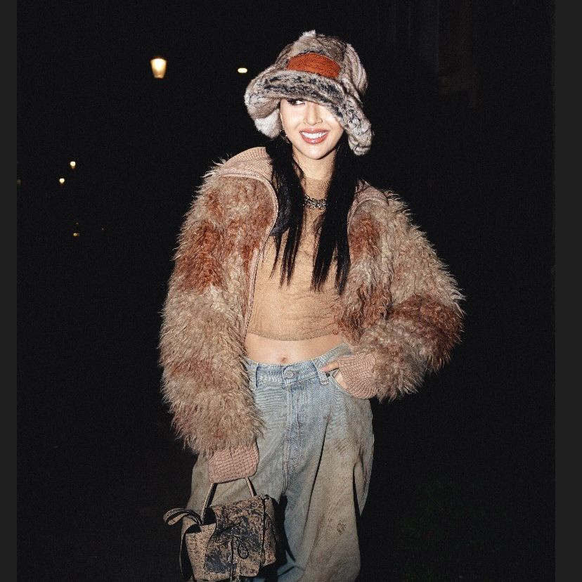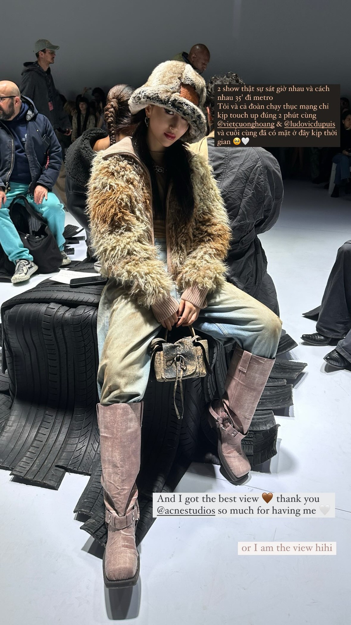 Chỉ trong một ngày, Quỳnh Anh Shyn liên tiếp tham dự 3 show diễn thời trang. Tại điểm đến cuối - Acne Studios, fashionista Hà thành biến hóa với tạo hình bụi bặm. Cô phối trang phục với tông màu nâu chủ đạo.