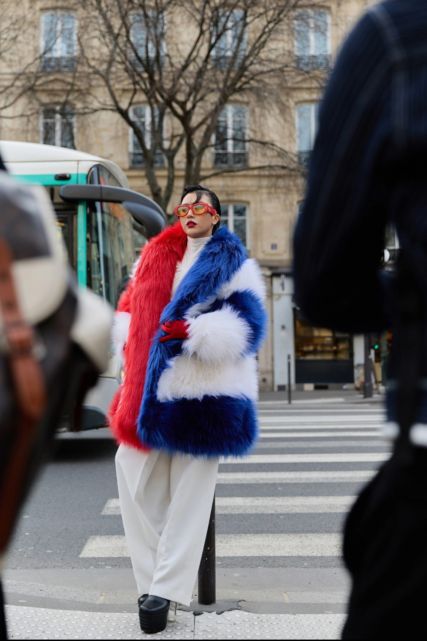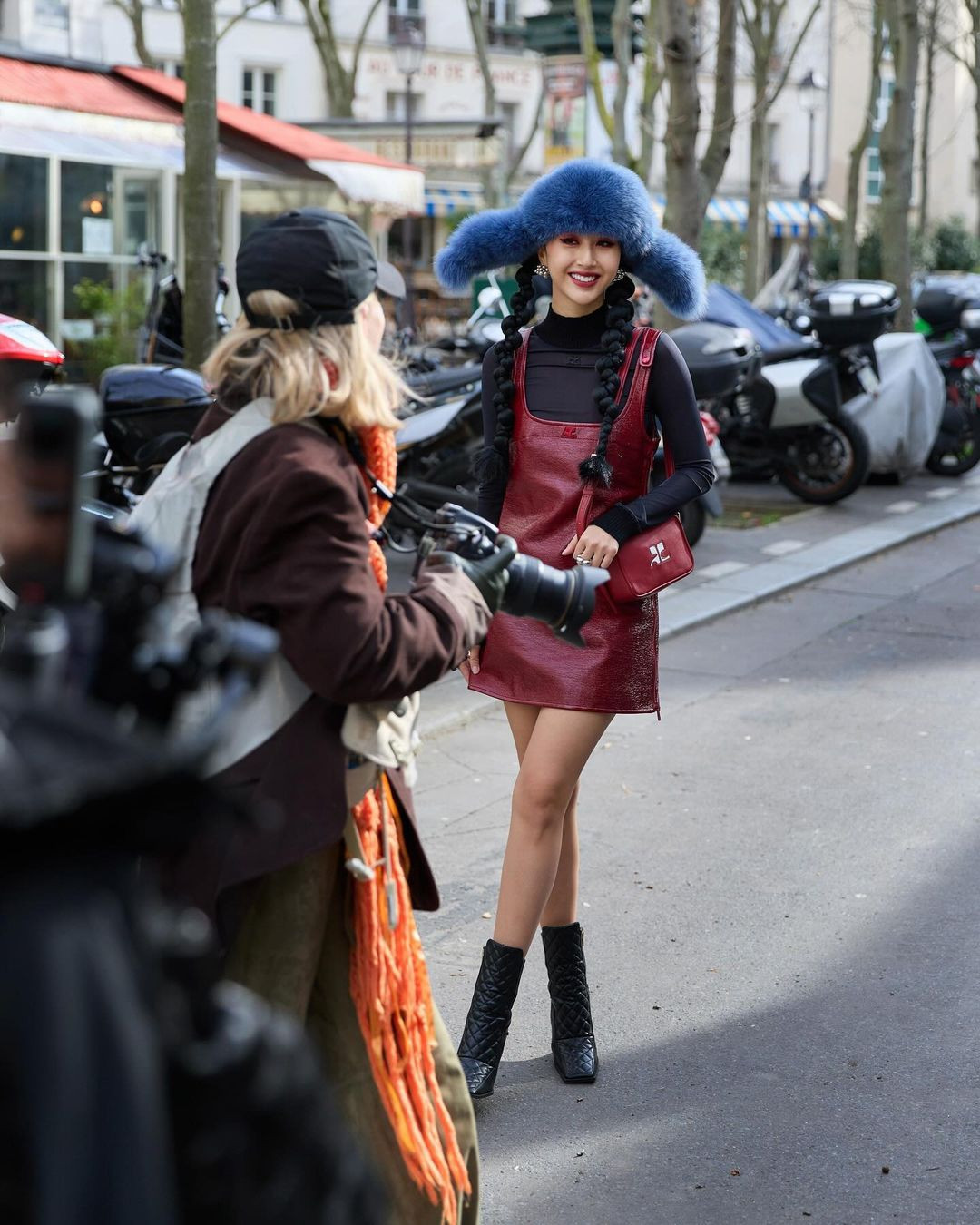 Fashionista 2,8 triệu followers khởi động hành trình với show diễn của nhà mốt Courrèges. Quỳnh Anh Shyn khoe sắc trẻ trung với trang phục tông màu đỏ đô thịnh hành, phụ kiện mũ lông xanh dương độc đáo trở thành điểm nhấn.
