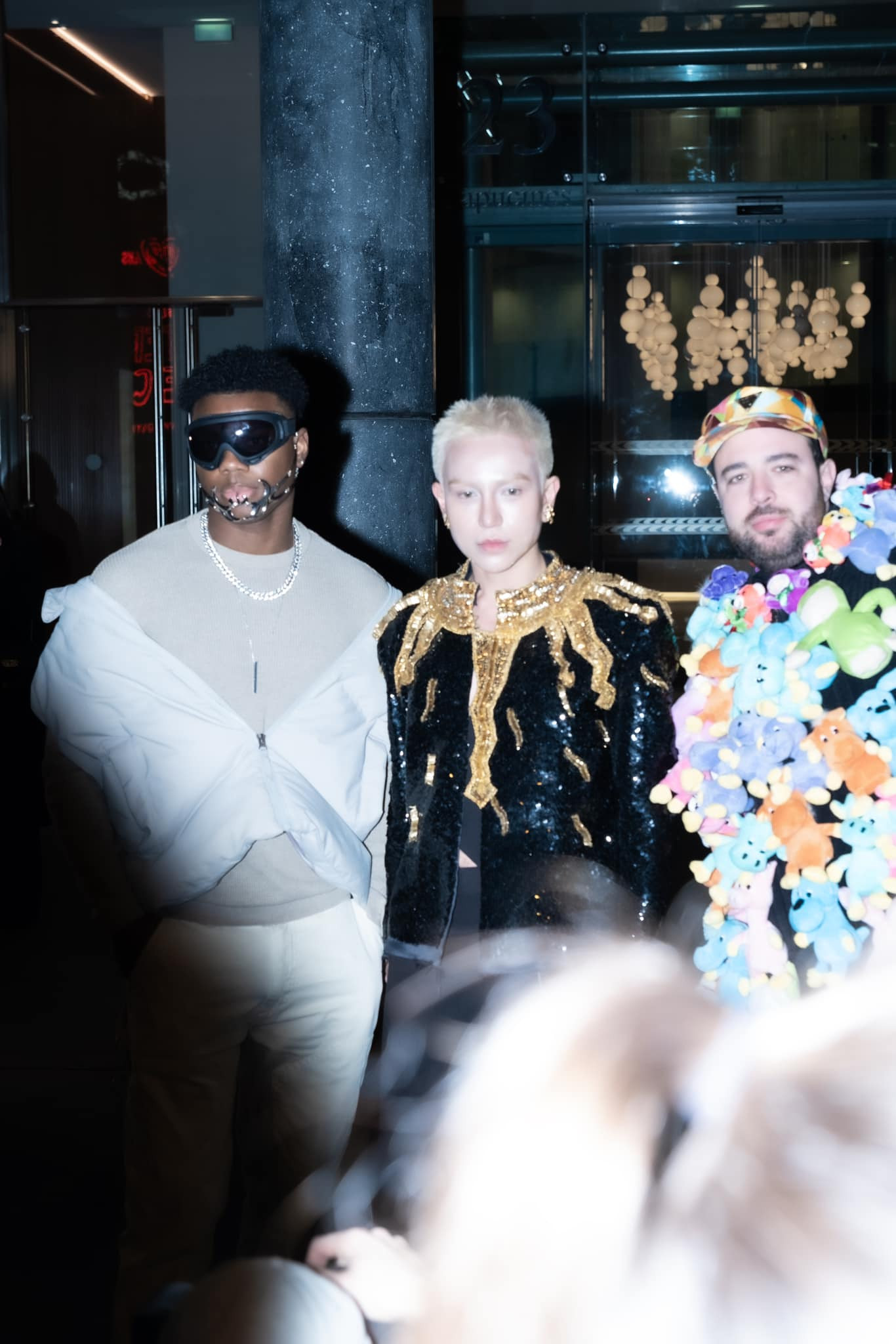 Sau đó, Call me Duy tham dự show diễn của nhà mốt Balmain. Anh chứng minh sự am hiểu thương hiệu bằng một tạo hình mang đậm hơi thở sang trọng của nhà mốt Pháp. Fashionisto “chiếm spotlight” giữa trời Âu nhờ chi tiết đính kết vàng gold trên áo khoác và khuyên tai cùng tông. Anh chàng cũng nhận về nhiều lời khen khi bắt kịp xu hướng make-up "búp bê sứ" từng gây sốt tại show Maison Margiela.