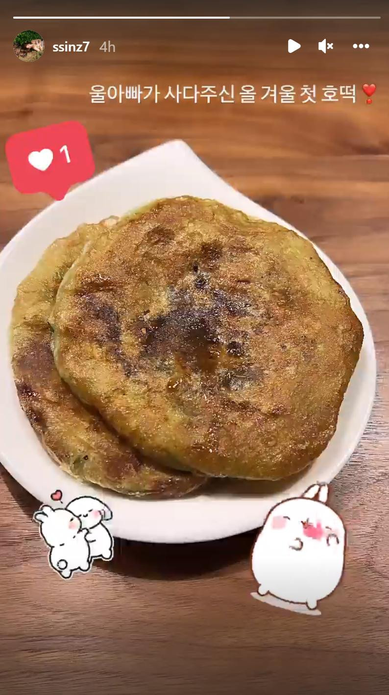 Trong mục Story của Instagram, Park Shin Hye còn chia sẻ một bức ảnh chụp bánh Hotteok (bánh rán Hàn Quốc) kèm chú thích: "Bánh Hotteok của mùa Đông này mà bố mình đã mua".