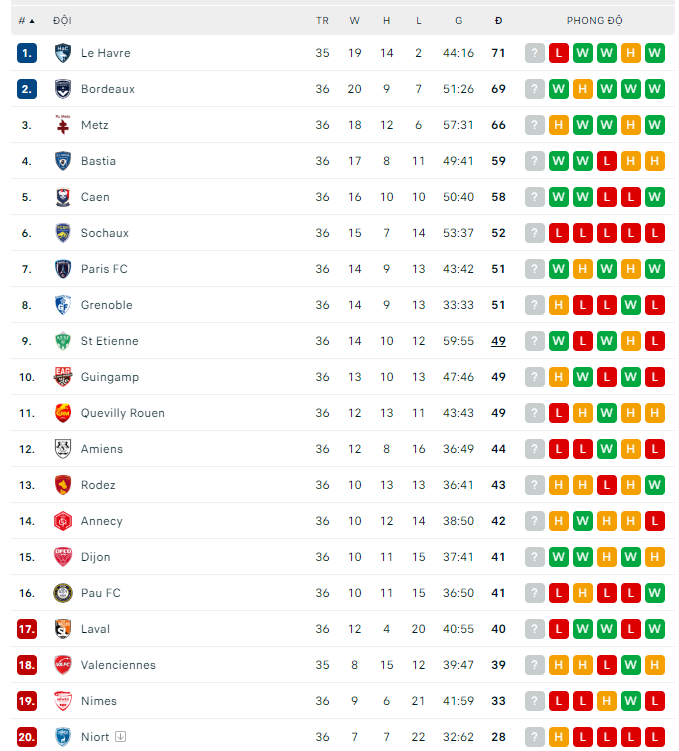 Bảng xếp hạng Ligue 2 mới nhất