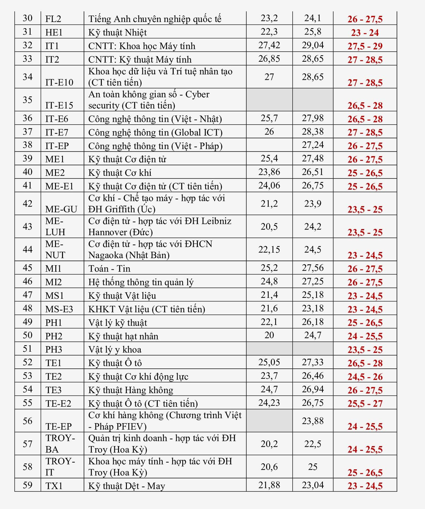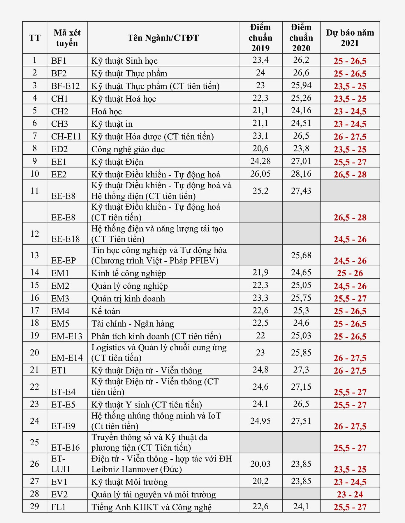 Trước đó, trường Đại học Bách khoa Hà Nội đã đưa ra mức dự báo điểm chuẩn tất cả các ngành đào tạo trong năm 2021. Theo đó, mức điểm chuẩn dự kiến của trường như sau: